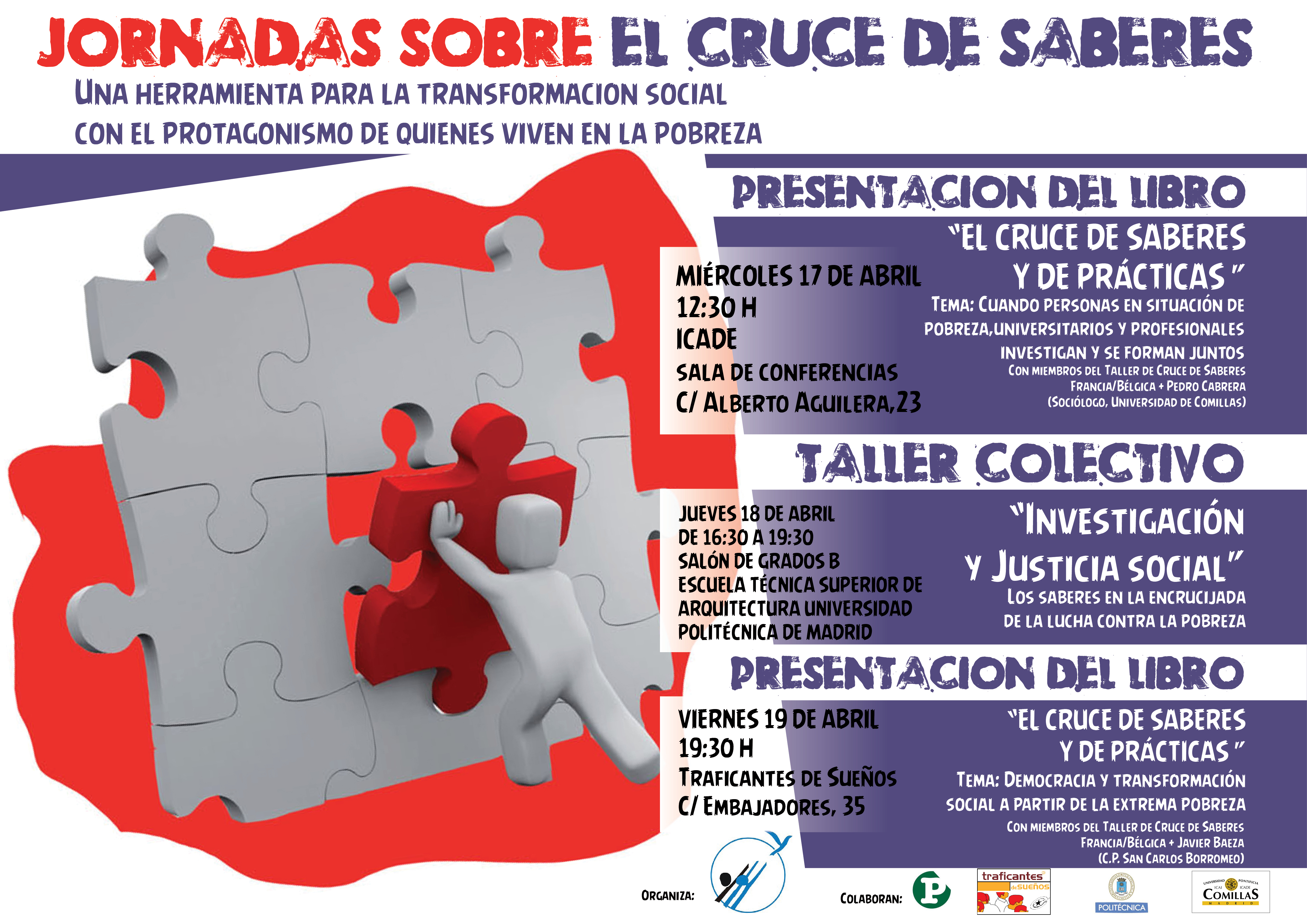 Organiza: Movimiento ATD Cuarto Mundo España Con la colaboración de: Ed. Popular, Universidad Pontificia de Comillas, ETSAM Universidad Politécnica, Traficantes de SueñosLa lucha contra la miseria y la exclusión concierne a muchos actores que se encuentran en posiciones desiguales. Entre ellos están las personas en situación de pobreza, cuyo saber, basado principalmente en su experiencia de vida, no suele ser reconocido ni aceptado como válido. De esta manera el resto de saberes (científico, de acción, etc.) quedan “incompletos”, y por eso se vuelven ineficaces e incluso generadores de efectos contrarios a los que, en principio, se quieren alcanzar.