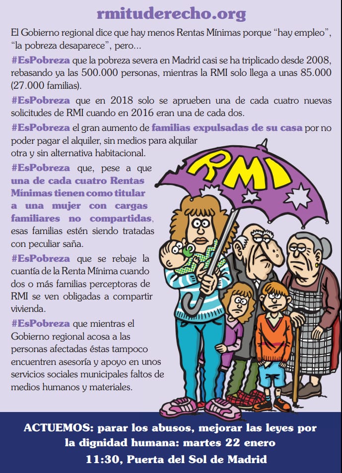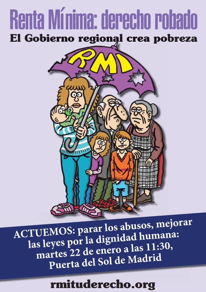 Por eso desde la plataforma RMI Tu Derecho se convoca el próximo martes 22 de enero a las 11:30 h a una concentración en la Puerta del Sol para reclamar el cese de los abusos por parte de la Comunidad de Madrid y el desarrollo de las leyes una línea respetuosa con la dignidad humana.