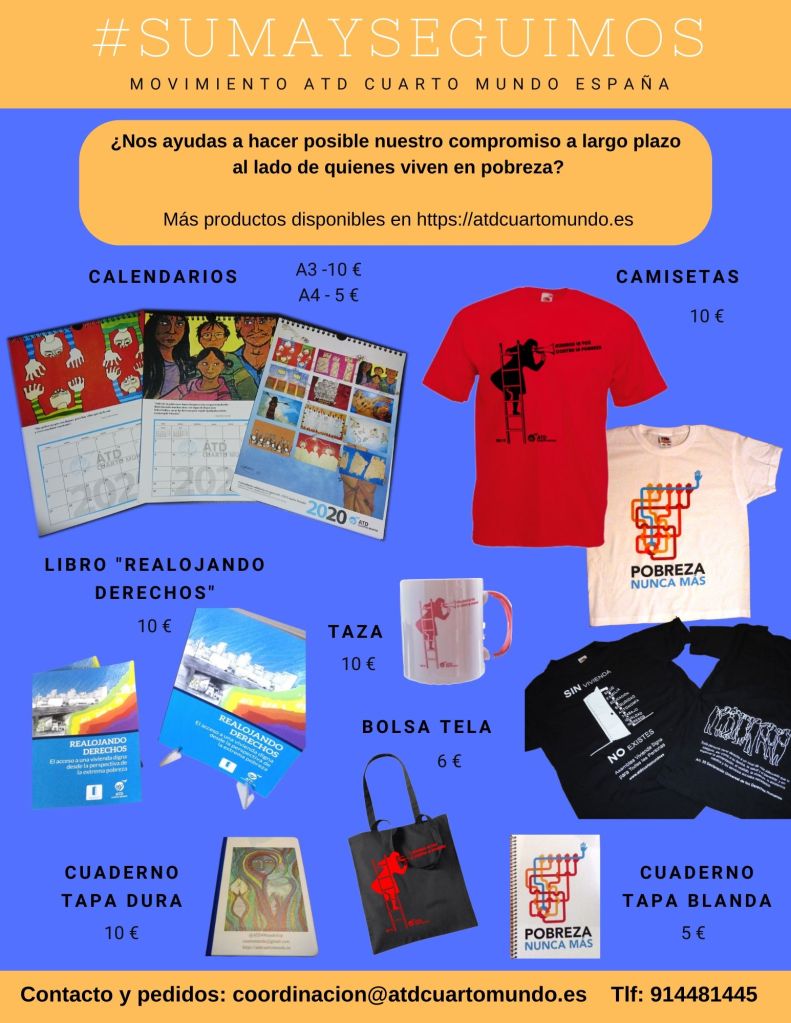 Hay calendarios (de artista peruano y voluntario permanente de ATD Cuarto Mundo Luciano Olazabal), libros, camisetas, tazas, cuadernos y mucho más…