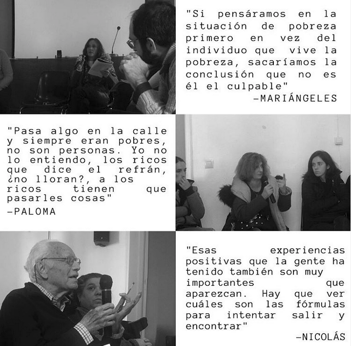 Una militante Cuarto Mundo añadió: “se gastan más dinero en investigar, en juzgar o en tapar que en resolver realmente. Cómo le dices a una persona ¡lucha!, cuando sabes que le van a poner todas las trabas, que le van a juzgar, le van a hundir como persona, que si tiene algo de dignidad la va a perder y si no la pierde se va a convertir en una persona con odio”. “Yo quiero ayudas de verdad, ayudas que no me hagan sentirme mal”. Otra participante apuntilló: “no quiero perseguir lo que por derecho me corresponde”.