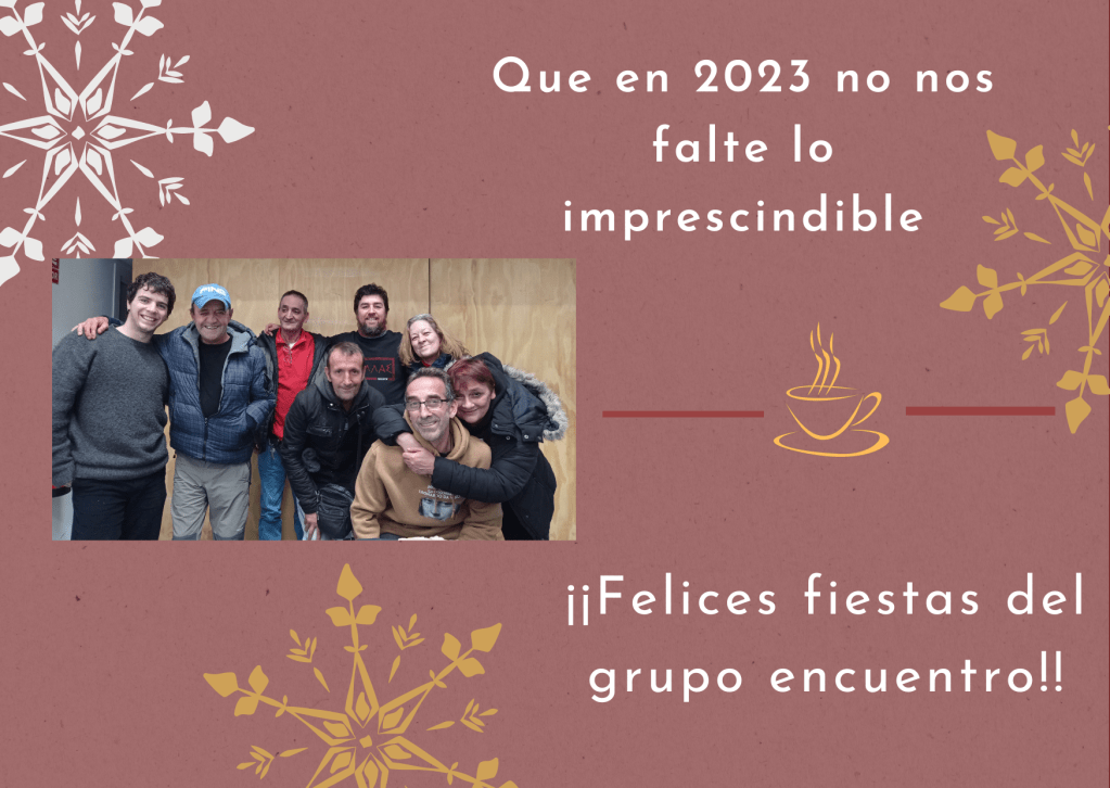 Esto es el grupo encuentro, desde hace ocho años: un espacio libre juicios, donde se espera lo mejor de cada persona; un espacio donde construir el respeto, donde aprender y aportar sobre temas y problemas que atraviesan nuestra sociedad. Un espacio en el que atrevernos a estar al día en vez de al margen, ir al cine, a un museo, cocinar, disfrutar de la naturaleza, participar en espacios colectivos, hacer un hueco para invitar a otras personas solas, excluidas, apartadas.