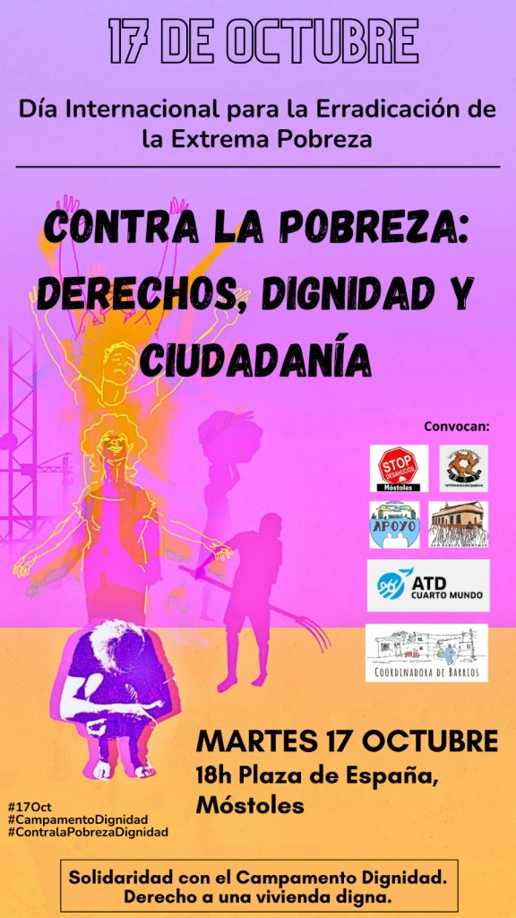 El encuentro tuvo lugar en la Plaza de España de Móstoles. Es precisamente en este municipio madrileño donde se localiza el Campamento Dignidad, una agrupación de más de 18 familias vulnerables sin alternativa habitacional que llevan desde el 18 de agosto viviendo acampados en las calles de este municipio después de su desahucio. En solidaridad con ellos y con todas las personas que viven en situación de pobreza; la plataforma Stop Desahucios Móstoles a la que pertenecen, la R.S.P Latina-Carabanchel, la asociación Apoyo, la parroquia San Carlos Borromeo, la asociación ATD Cuarto Mundo y la Coordinadora de Barrios convocaron una tarde de encuentro y reivindicación.