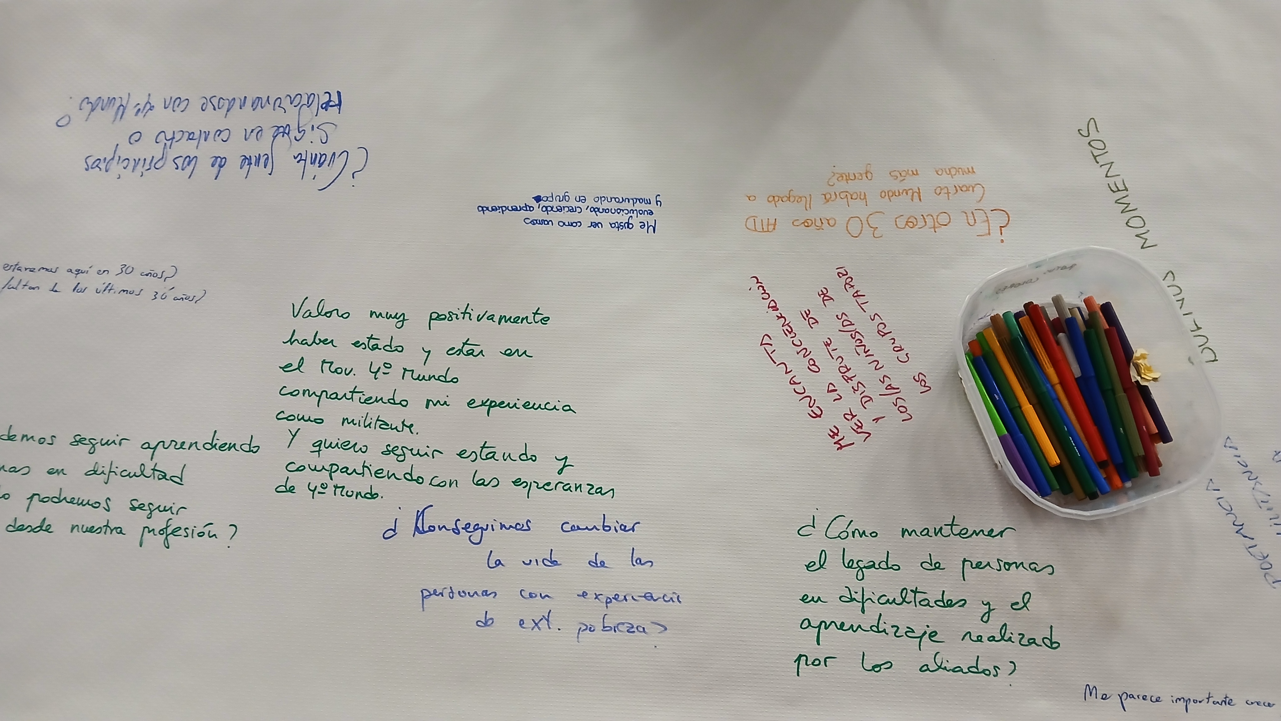 A día de hoy, cuando echamos la vista atrás, cuando somos testigos de la persistencia de situaciones de pobreza extrema, de desalojos, de humillaciones, de falta de atención, cuando observamos la vergüenza que viven muchas personas cercanas y miembros de Cuarto Mundo, cuando vemos cómo la violencia sufrida por quienes viven en miseria se transmite de generación en generación, dudamos de nuestros logros, de los múltiples éxitos, de los cambios profundos e irreversibles que se han producido en nuestras vidas.